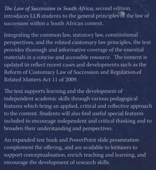 The Law Of Succession In South Africa - Second Edition - published in 2012, 328 pages, larger softcover, slight scuffing/some sentences highlighted etc otherwise all good.