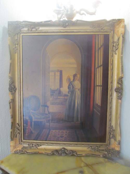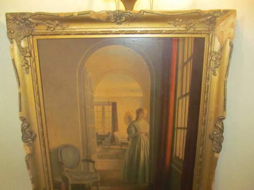 CONDITION : THE WOOD FRAME HAS OBVIOUSLY BEEN MOVED AROUND A BIT, RESULTING IN LOSSES TO THE EMBELLISHMENT ORNAMENTATION ALONG THE SIDES AND TWO CORNERS. THE WOOD ITSELF IS NOT DAMAGED IN ANY WAY AND NEITHER IS THE PRINT