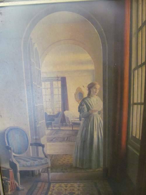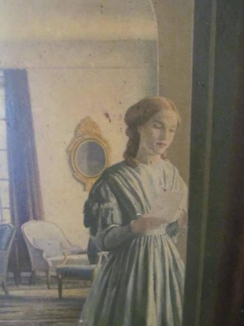 THE PRINT DEPICTS A 19th CENTURY INTERIOR SCENE WITH A BRUNETTE WOMAN IN A LIGHT BLUE DRESS STANDING NEAR THE CENTER OF THE COMPOSITION, READING A LETTER UNDER A CENTERED ARCH BESIDE A WINDOW. VICTORIAN STYLE CHAIRS, RUGS, LARGE WINDOWS AND DECORATIONS ARE ALSO PRESENT WITHIN THE PIECE. THE IDENTITY OF THE WOMAN PORTRAYED IS NOT CERTAIN BUT BELIEVED TO HAVE POSSIBLY BEEN A MEMBER OF THE COURTAULD FAMILY