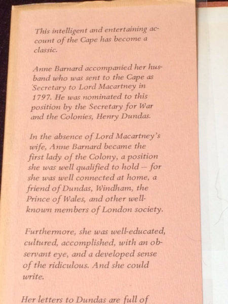 This intelligent and entertaining account of the Cape has become a classic. Anne Barnard accompanied her husband who was sent to the Cape as Secretary to Lord Macartney in 1797. He was nominated to this position by the Secretary for War and the Colonies, Henry Dundas. In the absence of Lord Macartney's wife, Anne Barnard became the first lady of the Colony, a position she was well qualified to hold - for she was well connected at home, a friend of Dundas, Wildham, the Prince of Wales, and other well-known members of London society.