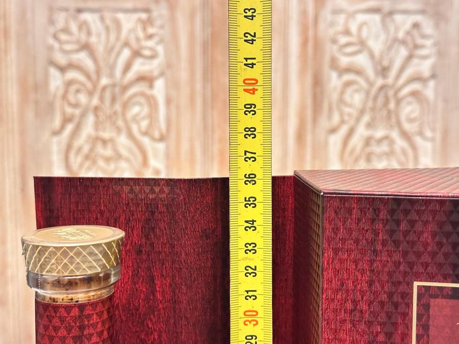 LARGE UNIQUE RARE CASK BOTTLE DESIGN WITH HEAVY GLASS BASE DISPLAYED IN A RARE CASK RICH MAHOGANY RED WHISKY SHOWCASE