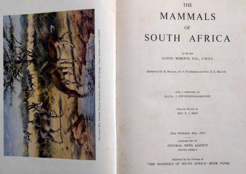 Second edition, 1954, 700 pages, large format. In excellent condition, some rubbing to cover and one small tear to bottom of spine, some very light foxing to internal pages. The definitive early work on SA mammals - a must-have for all enthusiasts, profusely illustrated with colour plates, photographs and line drawings.