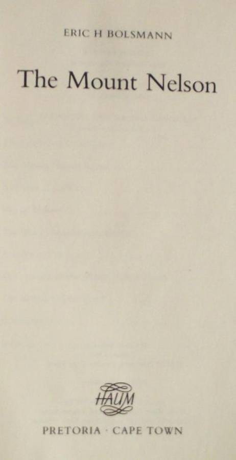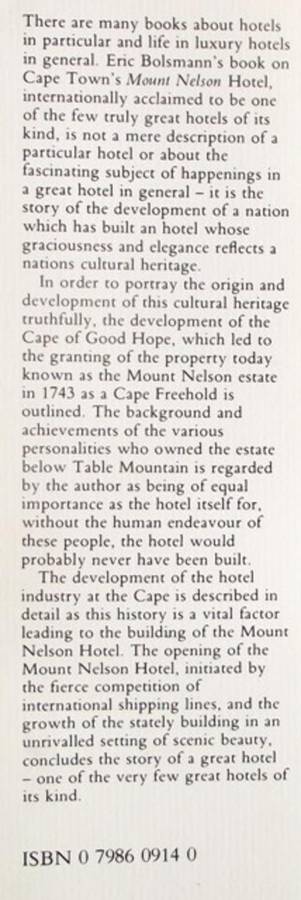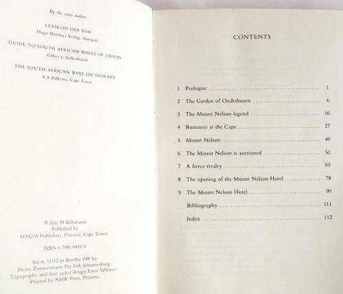 BOOK CONDITION HARDCOVER 120 PAGES 3 ROUND STAINS ON FRONT COVER OF D/J. WEAR TO EDGES OF D/J. BOOK IS CLEAN YELLOW BOARDS WITH PICTUTE OF THE ENTRANCE COLUMNS OF THE MOUNT NELSON ON THE FRONT.