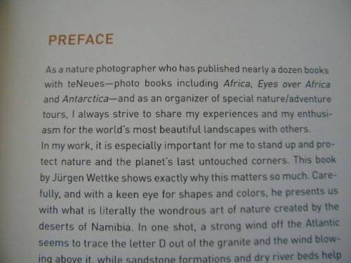 Large landscape format. Dimensions: 34cm x 26,5cm x 3cm. Hardcover, no d/j, in very good condition. Published 2016 by teNeues Publishing Group with 208 pages. Jürgen Wettke is a world renown photographer. Perspective and thoughtful use of light are very important to him. His photographs leave the viewers in awe at the sheer beauty of nature. The Namib is the oldest desert on earth and the only coastal desert. This book organizes photographs by region: the Naukluft and Sossusvlei in the south, Waterberg and Etosha in the east, Brandberg and the Skeleton Coast in the west and Hartmann Valley and Kunene River in the north. Enjoy nature through Wettke's camera! No shipping overseas.