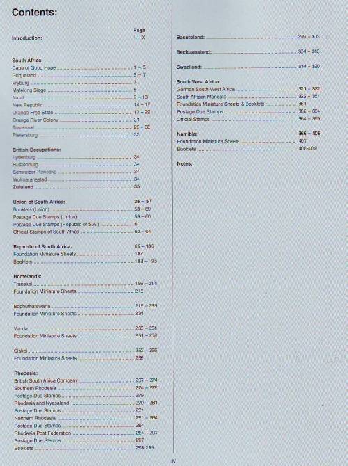 The Republic and Union of South Africa, Bophuthatswana, Ciskei, Transkei,Venda, South West Africa, Namibia, German South West Africa. The Rhodesias,Bechuanaland, Basutoland and Swaziland. The Cape of Good Hope, Griqualand, Vryburg, Mafeking Siege, Natal New Republic, Orange Free State, Orange River Colony, Transvaal, Pietersburg, British Occupations, Lydenburg, Rustenburg, Schweizer Renecke, Wolmaranstad and Zululand.