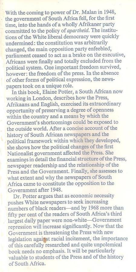 The Press as Opposition - The Political Role of South African Newspapers  By: Elaine Potter