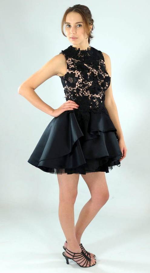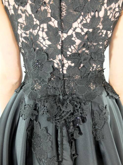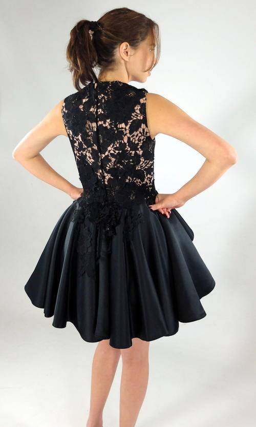 Fabulously fun short black cocktail dress with satin skirt and lined, structured black lace top. Button up back with beautiful detail