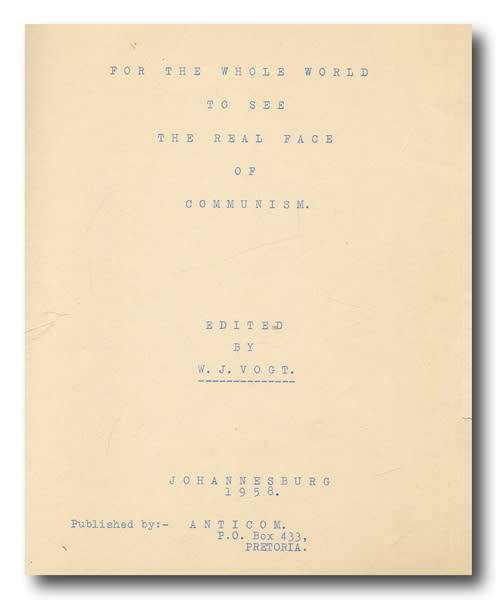 The Real Face of Communism edited by WJ Vogt (1958). A5, Paperback, 95 pages. Cover quite worn - specially edges and spine but still in one piece. Book in readable condition. Pages yellowed.