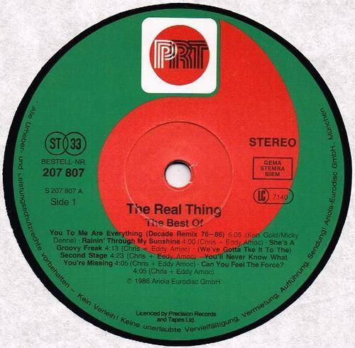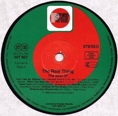 1986 German PRT RECORDS pressing, release number 207 807, of compilation album by The REAL THING: The Best Of. The track & other details are shown on the images, as provided. The record has a number of faint and ineffective sleeve-scratches, otherwise in a very good plus condition. The cover has lightly scuffed corners and edges, a partly weakened lower left corner, plus some edge crinkles & very light ring-wear, otherwise still in a very good plus shape. VG+ / VG |