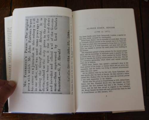 " The author collected various papers ( letters and diaries) of the Essex/Rabone family into an account of pioneer life more than a century ago. Alfred Essex, editor, printer, proprietor and publisher of the Graaff Reinet Herald who came to South Africa in 1843, invites his father and sisters to leave depression-ridden London and join him in this land of boundless opportunity.