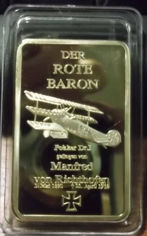 The Red Baron Manfred von Richthofen GOLD Bar 1 OZ .999. 100 MILLS GOLD Plated