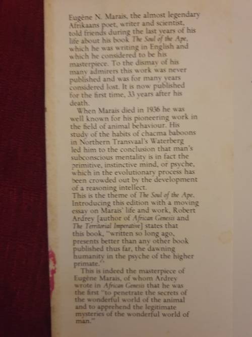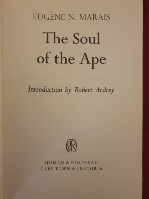 Eugene N. Marais, the almost legendary Afrikaaans Poet, writer & scientist, told friends during the last years of his life about this book The Soul of the Ape, which he was writing in English, and which he considered his masterpiece.