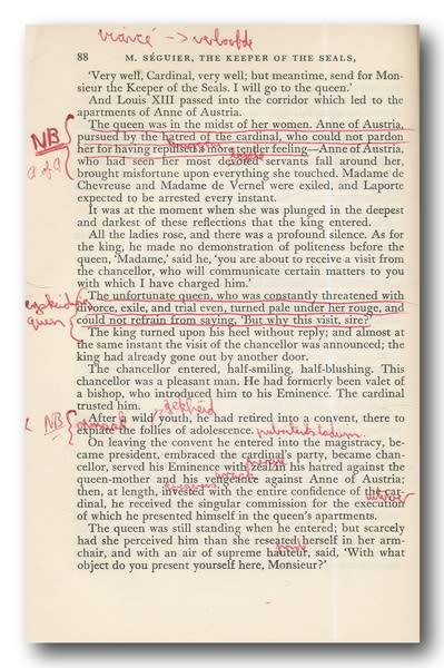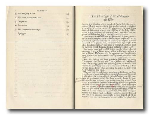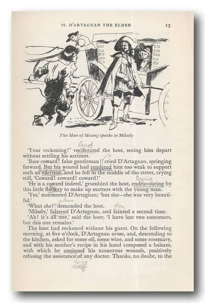 The Three Musketeers by Alexandre Dumas (1957). A5, Hard cover, 317 pages. Coverbit worn. Book in good readable condition. Lots of notes in penciland pen on various pages - old school book.