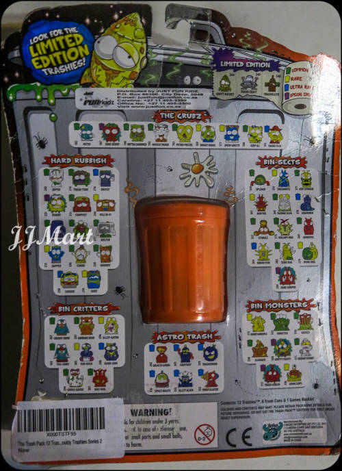 Series 2 is the second series of The Trash Pack. It replaces green trash cans with orange trash cans, and features a new category that replaces the Bin-Fections: Astro Trash . Astro Trash are metallic. There are also 3 limited editions, and they are Grott Rocket, Trash Craft, and Trashellite. The special editions are flocked "Mouldy" trashies.