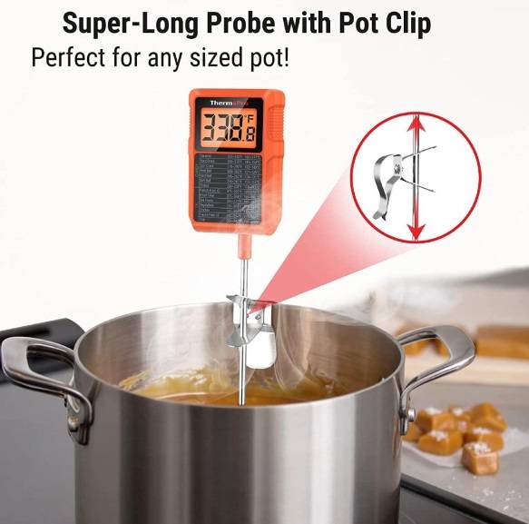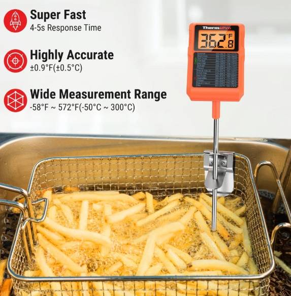 The instant-read oil thermometer is the best solution for affordable candy making and deep-frying. The 20cm long probe and the pot clip make this digital food thermometer suitable for any application. You can set the most appropriate angle to view the crystal clear LCD display from anywhere. Take your candy and deep frying to the next level.