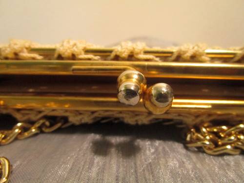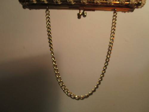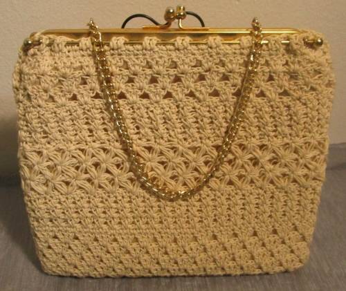 This is a beautiful vintage crochet box purse. It is a natural colored crochet box handbag with a gold tone metalhandle, and gold tone latch. The interior is lined with a beige cloth,