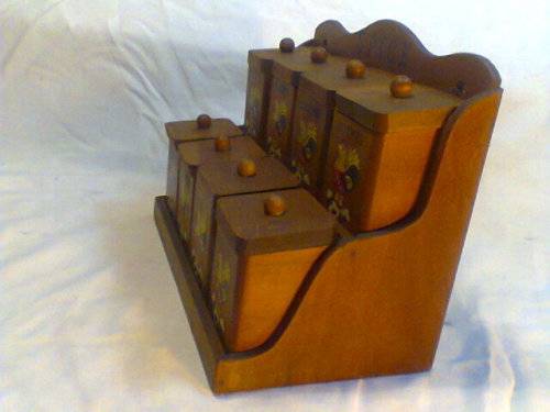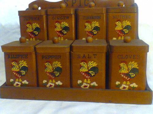 This is for the collector a awesome solid wood hand made with hand painted Rooster motif. wall mounted Spice Rack. 8 Container's + Lid's. This item is in 100% condition and will look impressive in your kitchen.