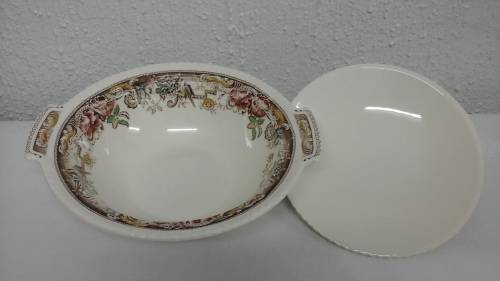 THIS VINTAGE DEVONSHIRE JOHNSON BROS OF ENGLAND PATTERN NO 118579 SERVING DISH IS STUNNING. IT HAS A LID THAT HAS AN INTERESTING DESIGNED HANDLE
