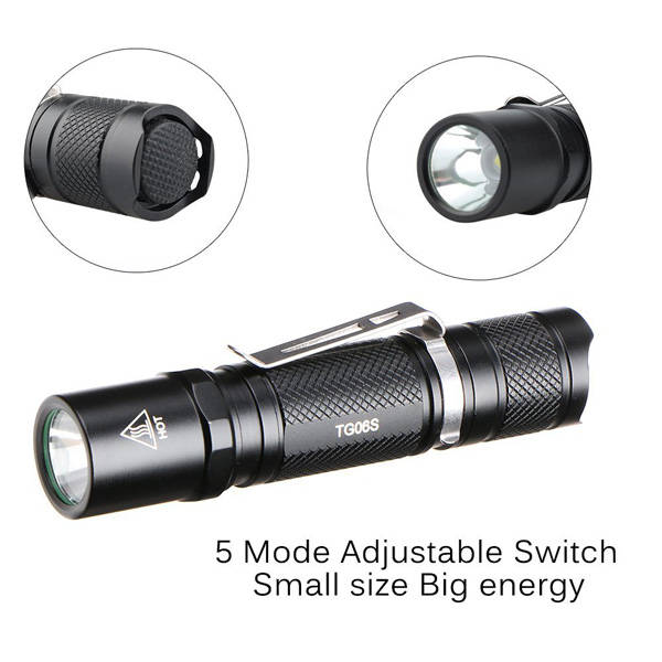 New Features on TG06S: 1. More Modes: When use premium 14500 battery, the brightness can be High(500LM) -Middle(200LM) -Low(50LM)-Moonlight (1LM ), and Strobe(500LM); When powered by AA battery, the mini light gives out High(150LM) -Middle(80LM) -Low(20LM)-Moonlight (0.5LM ), and Strobe(150LM)