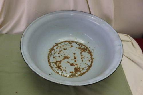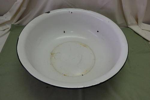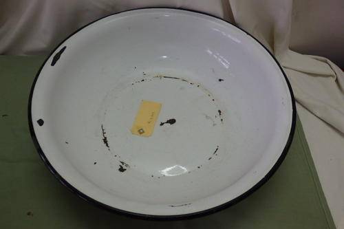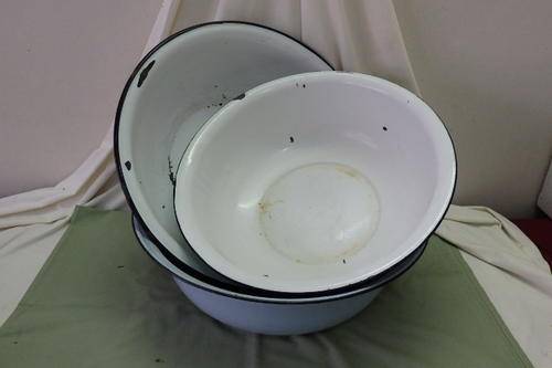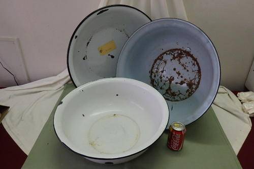 THESE THREE AWESOME "EXTRA LARGE" VINTAGE ROUND ENAMELWARE BASINS MEASURE BETWEEN 46cm ACROSS x 15cm HIGH AND 50cm ACROSS x 17cm HIGH. THE BASINS HAVE BUMPS AND NICKS AND SCRAPES ETC WHICH IS WHAT GIVES THESE AWESOME BASINS THEIR APPEAL. USED AS DECORATIVE PIECES OR EVEN FLOWER POTS, THEY ARE STUNNING AND VERY COLLECTABLE ENAMELWARE PIECES.