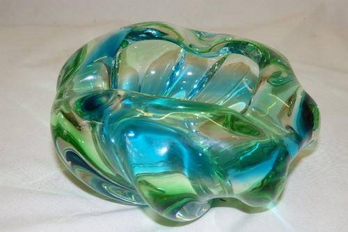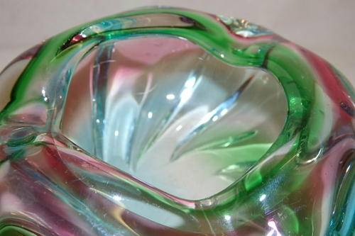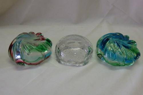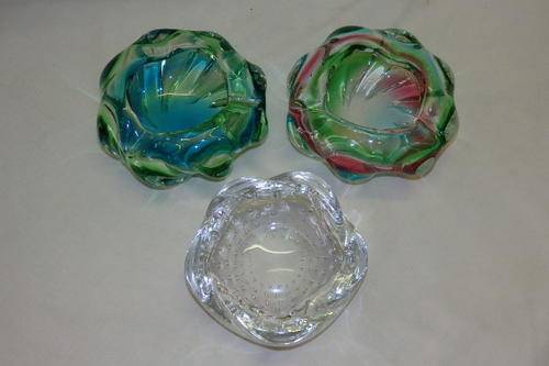 THIS FANTASTIC COLLECTION OF THREE ASSORTED "DESIGNER" HAND BLOWN/ MADE MURANO GLASS ASHTRAYS MEASURE ROUGHLY BETWEEN 12 AND 13cm ACROSS AND HAVE GOOD WEIGHT TO THEM. THEY ARE SOLID AND HEAVY ASHTRAYS. THERE ARE MINISCULE CHIPS ON THE BASES OF THE ASHTRAYS, BUT NO CRACKS ETC.