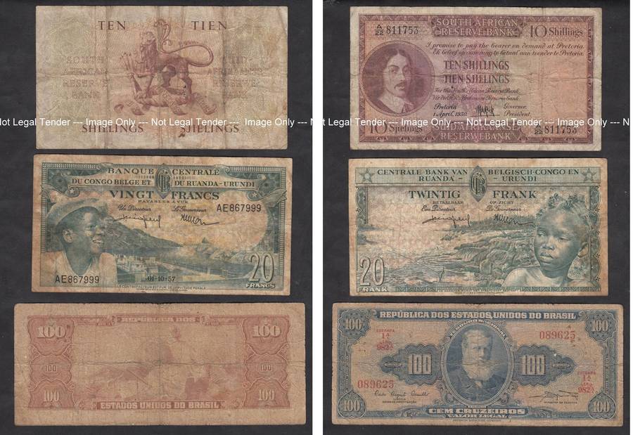 The well circulated notes are a South African 10 Shillings of 1 April 1950, a Belgium Congo 20 Francs of 1 October 1957 and a Brazil 100 Cruzeiros (unsure of the date either 1950s or early 1960s).