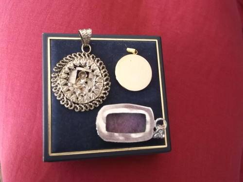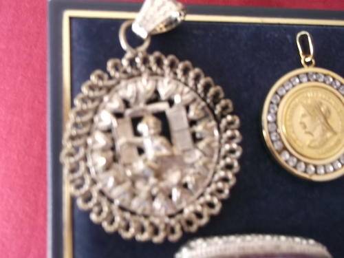 Here we have 3 pendants set in silver and gold colour metal (Please note they are metal not gold or silver). One silver plated one on the left of the picture is most unusual, it has a little child with a watering can watering flowers, the one with a faux Victoria coin is surrounded with paste stones and the last one is a genuine Zoisite gemstone set in what also looks like silver plate. All the pendants are in good condition just normal wear. Note one bid for all 3. Thanks for looking.
