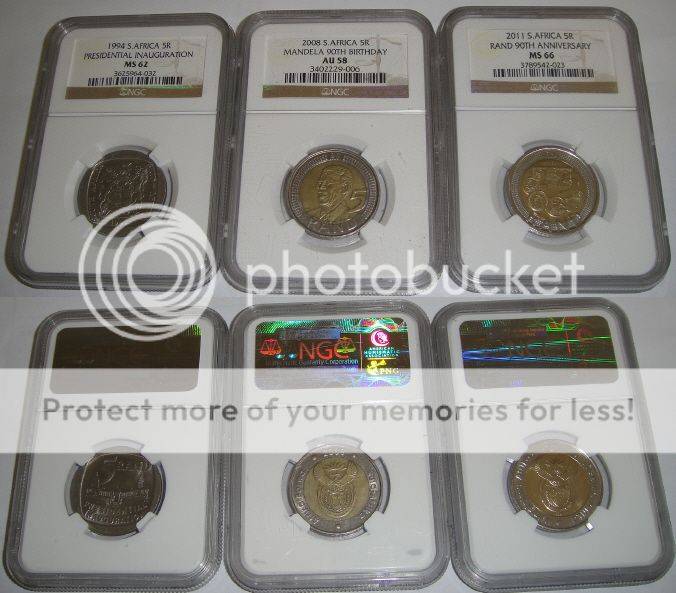1994 Presidential Inauguration (MS62), Mandela 90th Birthday (AU58) and Rand 90th Anniversary (MS66 or better).