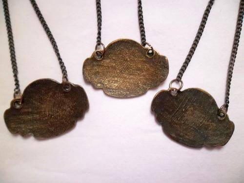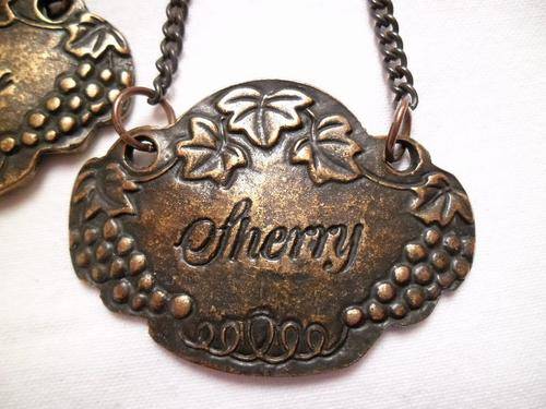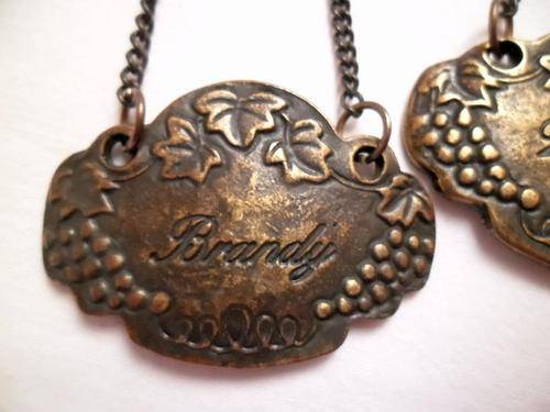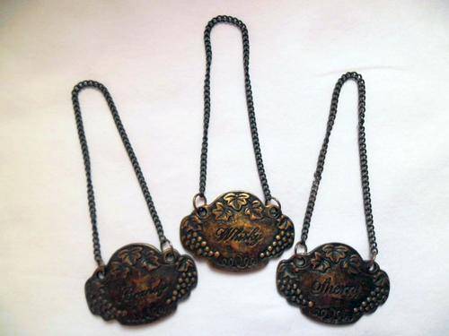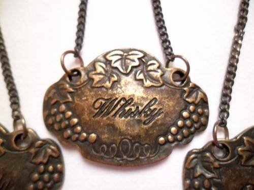 THREE SMALL VINTAGE BRONCE BOTTLE DECANTER LABELS HANG TAGS, WHISKY - BRANDY - SHERRY