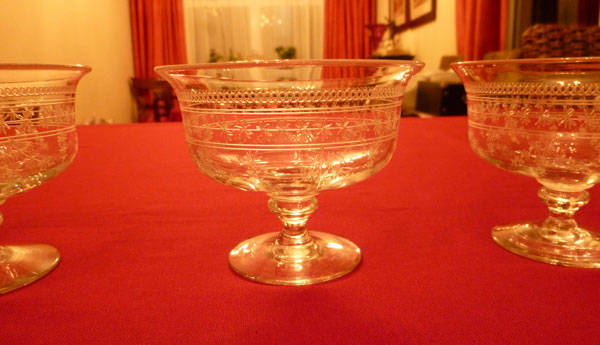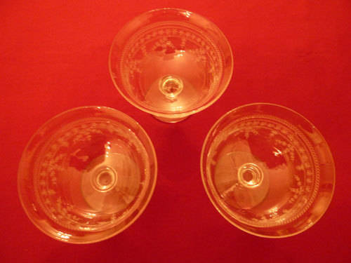Three pretty Stuart crystal dessert bowls with etched decoration. These little bowls are useful as sweet or peppermint dishes, for condiments, or to serve the pickles and preserves with cheese. They measure 10cm wide at the top and stand 7.5cm high. They are in good condition.