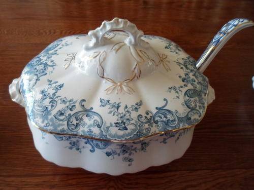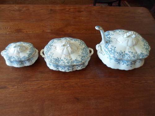 THREE BLUE AND WHITE DUNN BENNETT & CO GRADUATED TUREENS WITH LIDS