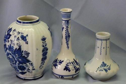 THESE THREE STUNNING DELFT OF HOLLAND HAND PAINTED BLUE AND WHITE VASES INCLUDING A KROON DELFT VASE AND TWO DELFT BLUE VASES. THE KROON DELFT VASE HAS A CHIP ON THE RIM. THERE IS A LITTLE AGE AND USAGE RELATED WEAR AND TEAR AND CRAZING ON THE VASES.