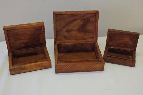 THESE THREE STUNNING HAND CARVED "DIFFERENT SIZE" SOLID WOODEN STORAGE BOXES WITH BRASS INLAY DESIGN WORK ARE DESIGNED TO FIT INTO EACH OTHER. THE LARGEST BOX MEASURES 20.5cm x 15cm x 8cm, THE MEDIUM BOX IS 17cm x 12cm x 6cm AND THE SMALLEST BOX IS 14cm x 9cm x 4.5cm. ALL THREE BOXES HAVE HINGED LIDS.