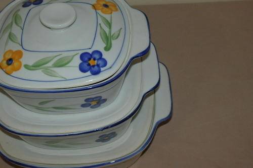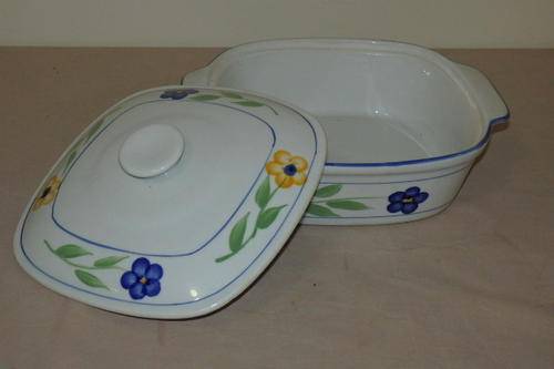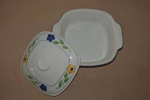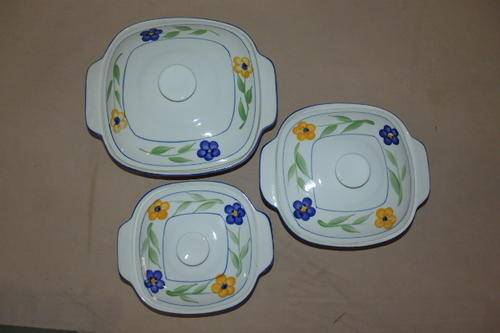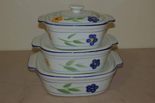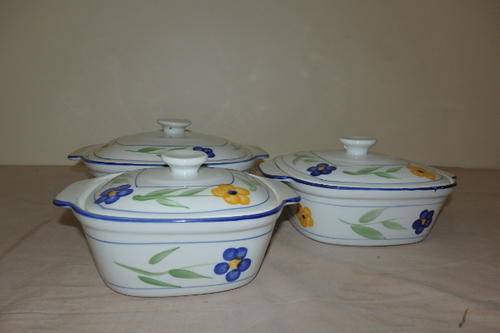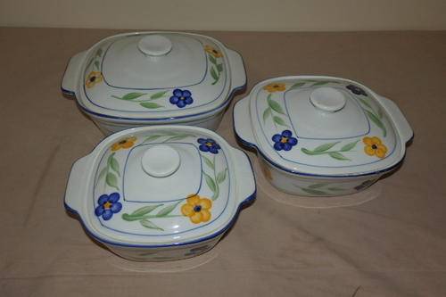 THIS COLLECTION OF THREE STUNNING SQUARE (LIDDED) CERAMIC ROASTING/ SERVING DISHES/ BOWLS IS IN PRISTINE CONDITION AND I DOUBT THAT THEY HAVE EVER BEEN USED. THE SET CONSISTS OF THREE DIFFERENT SIZE BOWLS WHICH ARE OVEN, DISHWASHER AND MICROWAVE SAFE. THE BOWLS ARE 25cm LONG (HANDLE TO HANDLE) x 21.5cm ACROSS, 22cm LONG (HANDLE TO HANDLE) x 18.5cm ACROSS AND 19cm LONG (HANDLE TO HANDLE) x 16cm ACROSS RESPECTIVELY.