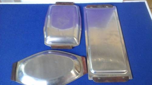 THESE FANTASTIC PIECES ARE DIFFERENT IN SHAPE AND SIZE. THE DISHES ARE MADE FROM STAINLESS STEEL. THEY ALL HAVE TWIN HANDLES THAT ARE MADE FROM WOOD.