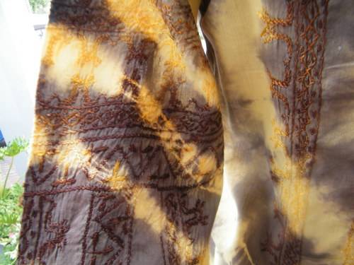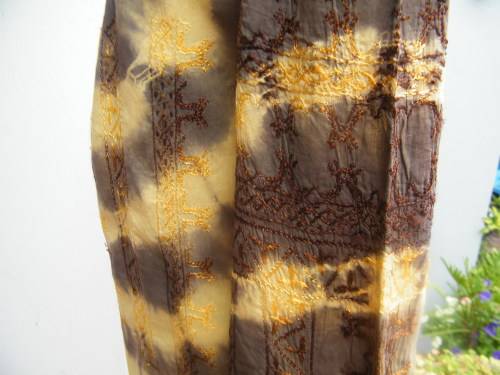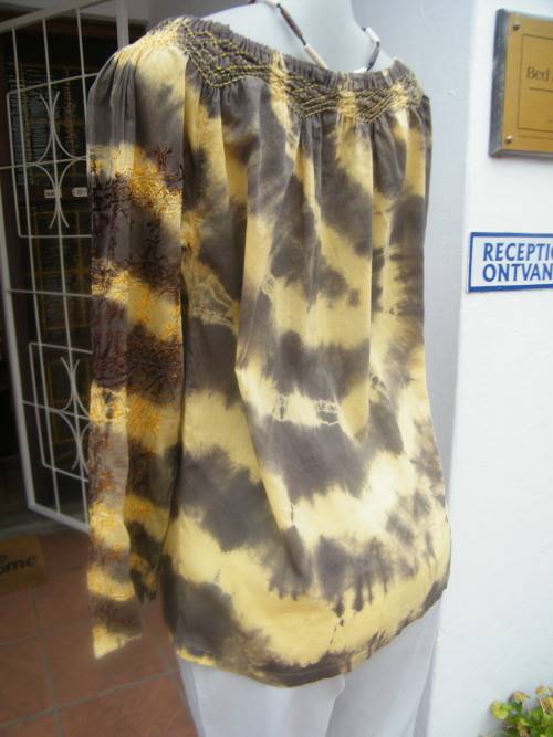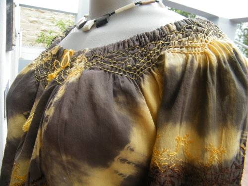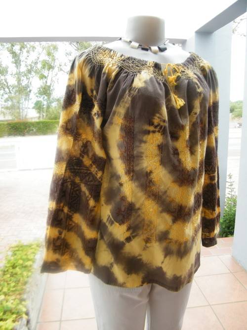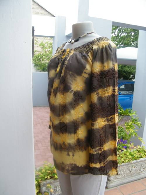 tie dye top in brown and yellow with embroidery.Size 36/12.Rounded drawstring neckline.