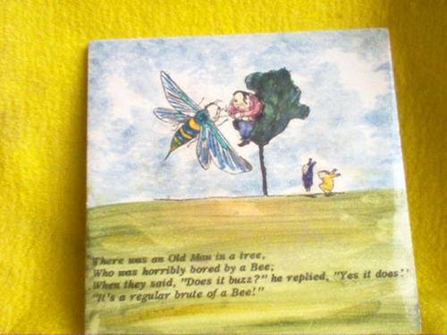 A FUNNY OLD TILE HAND PAINTED OF A MAN IN A TREE BEING BOTHERED BY A LARGE BEE. THE RHYME GOES THERE WAS AN OLD MAN IN A TREE,WHO WAS HORRIBLY BORED BY A BEE, WHEN THEY SAID ''DOES IT BUZZ? he replied "YES IT DOES ITS A REGULAR BRUTE OF A BEE. THE REVERSE IS COVERED WITH FELT SO NO MAKERS MARKS ARE VISIBLE . IT IS IN GOOD CONDITION.