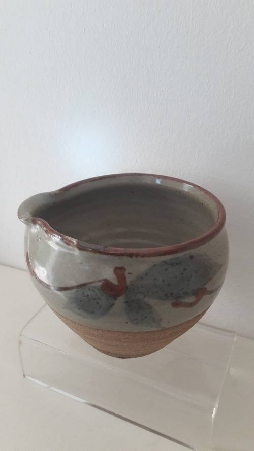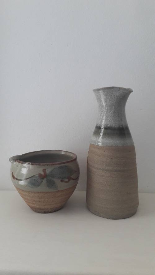 Offered for sale is an attractive stoneware carafe (wine or water jug) by the late Tim Morris (1941-1990 ) a highly esteemed South African studio potter. This a hand thrown item made from high fired stoneware with the upper portion of the carafe glazed and hand painted with an elegant Japanese inspired motif of abstracted flowers and twigs. The palette is earth coloured and subdued with the body of the carafe unglazed in a granular textured brick coloured stoneware. The upper painted portion is in a pale grey/off white glaze with the motif of flowers and twigs in a pale blue and dark brown.
