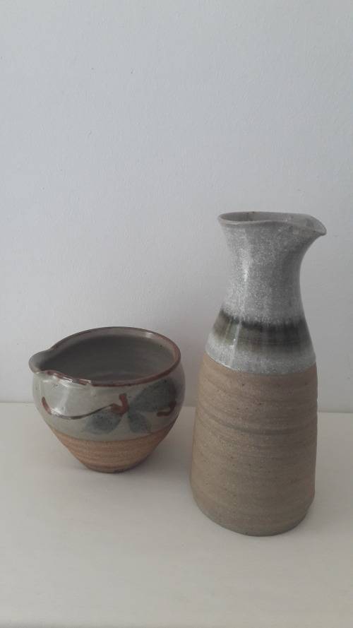 This carafe is one of two ceramic pieces by Tim Morris listed separately; the other complementary item is a tall stoneware carafe in a similar style