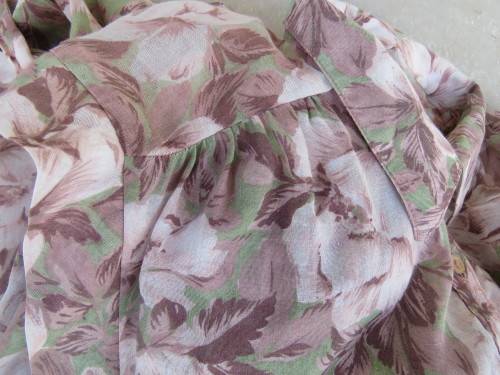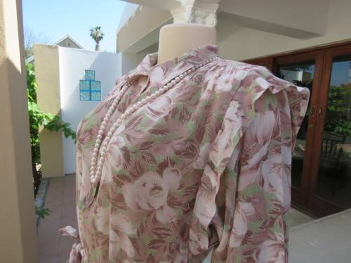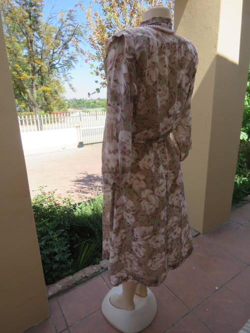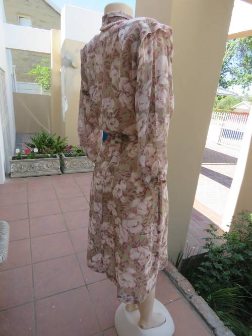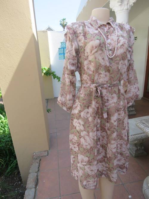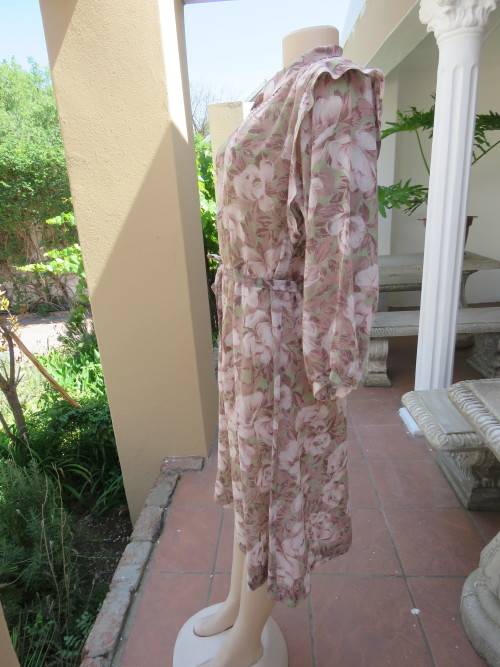 Timeless long kimono sleeve dress in tasteful pale pink and soft green floral pattern.Size 38/14.Yoked shoulders.Open with 4 buttons on front.Shirt collar.Elasticated waist with fabric belt.In cool dacron fabric.Good cond.