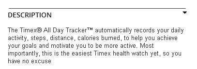 The Timex® All Day Tracker™ automatically records your daily activity, steps, distance, calories burned, to help you achieve your goals and motivate you to be more active. Most importantly, this is the easiest Timex health watch yet, so you have no excuse - See more at: http://global.timex.com/node/81146#sthash.QKSPSTAT.dpuf