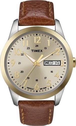 Warm tones and a sleek design define this Men's T2N105 Casual Dress Strap Watch from Timex. Framed by a smooth; brass bezel; the round; beige dial features crisp; gold-tone Arabic numerals marking the hours; an inner 24-hour track; and super-luminous; gold-tone outlined; sun-ray hands. A convenient outside minute track helps with detailed time telling; and a day and date display sits just inside three o'clock. The patterned; brown leather strap is detailed with contrast stitching and fastens with a traditional buckle for a comfortable fit. This fashionable timepiece is evenly backlit with Indiglo® for better nighttime viewing; and with a water resistant depth of 99 feet (30 meters); you can confidently wear this versatile timepiece with casual or professional wear.