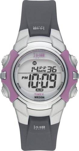 The Timex Women's T5J151 1440 Sports Digital Black/Pink Resin Strap Watch offers a crisp; digital dial with a 24-hour chronograph and a daily alarm. The light-weight and durable resin construction make it ideal for your daily running; swimming; or jogging routine. Plus; it offers a two time zone setting that makes traveling easy. An Indiglo night-light features allows you to tell time even in low-light conditions while a strong acrylic window offers protection from scratches and nicks. The watch is equipped with a reliable quartz movement and is water-resistant to 165 feet (50 meters).
