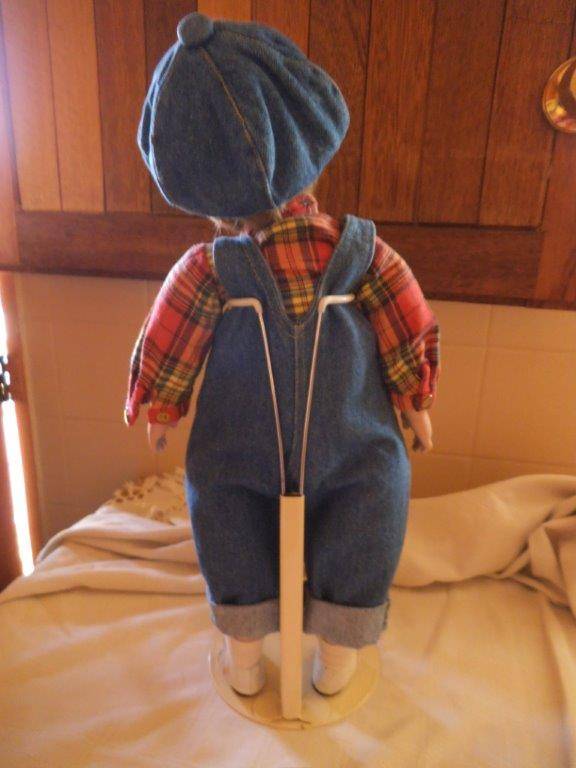 On auction we have this beautiful porcelain doll, Timothy. He comes with a stand and is 46cm tall and approximately 19 years old. Please view photo's closely as it forms part of the description and will show his excellent condition.