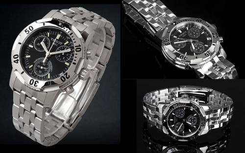 TISSOT Men's sports watch Case size: 39.8mm diameter (12mm thickness) Swiss made quartz battery movement Black round dial with three black sub dials and luminous hands and hour markers Stainless steel case Stainless steel bracelet with locking clasp (standard bracelet inner circumference 20cm / 8 inches) Dial window material type: scratch-resistant-sapphire Clasp: deployment-clasp-with-push-button Unidirectional rotating divers bezel Scratch resistant sapphire crystal Date calendar at 4 o'clock position 1/10th second Chronograph function Water resistant up to 200m with screw down crown Model Number: T17148655