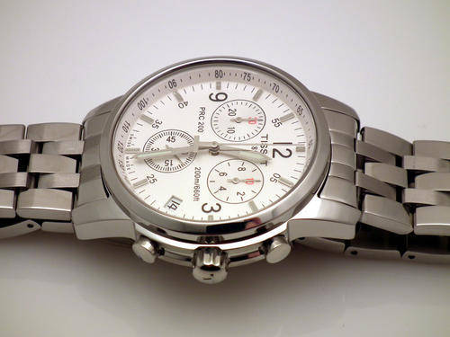 Stainless steel case with a stainless steel bracelet. Fixed bezel. White dial with luminous hands and stick hour markers, Arabic numerals mark the 3, 9 and 12 o'clock position hour markers. Tachymeter scale around the outer rim. Luminiscent hands and dial markers. Date display at the 4 o'clcok position. Three Sub-dilas; 60 seconds, 30 minutes and 1/10th of a second. Swiss ETA G10.211 Quartz movement. Scratch resistant sapphire crystal. Case diameter: 40 mm. Case thickness: 12 mm. Folding deployment clasp. Water resistant at 200 meters / 660 feet. Functions: hours, minutes, seconds, date, chronograph, tachymeter.
