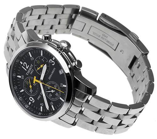 Mens Sports Designer Watch Black Tone Dial Steel with Luminous Insert Hands Silver Tone Hour and Minute Markers Tachymeter For Enchanced Functionality Chronograph Functions with Sweeping Hand High Quality Swiss Quartz Movement Date Display Window at 4 o'Clock Perfectly Formed Sapphire Crystal Glass Polished Stainless Steel Head Casing Polished Stainless Steel Case Water resistant (approx. 200 meters / 660 feet) Original Tissot Display Case with Outer Box Complete Instruction Manual & History of Tissot Book plus Tissot Catalog.