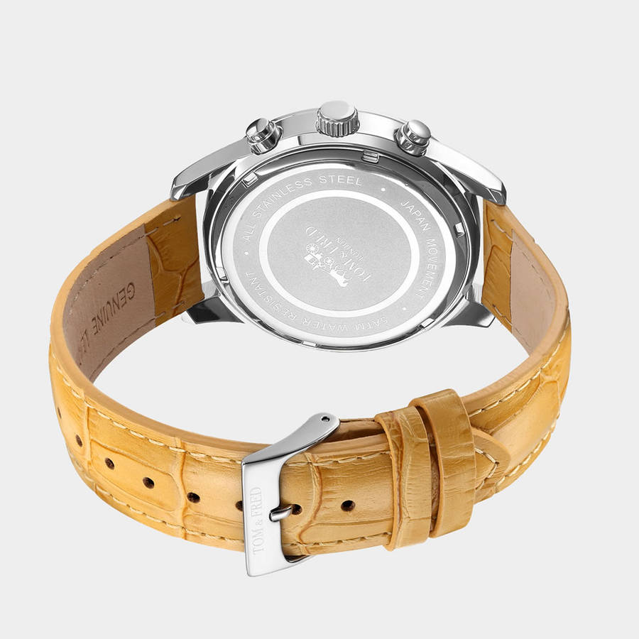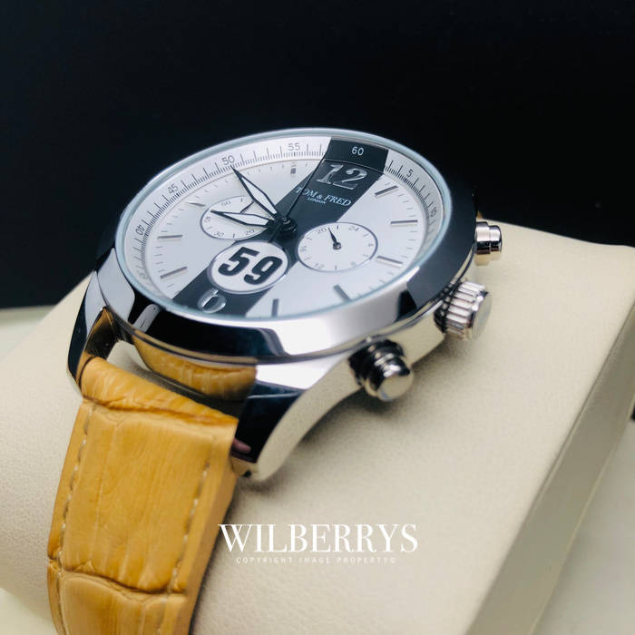 Start your engines. This sporty yet seasoned Tom & Fred watch pays homage to the great British racing machines and fierce driver rivalries of the 1960s and '70s. A luxurious, butter soft British leather strap is expertly combined with a 42mm casing which houses a race numbered '59' dial. The '59' a tribute to the British Lotus race machines driven by legends such as James Hunt & Graham Hill. Powered by a unique chronograph movement that measures 24 hours and 60 minutes. A traditional buckle secures it to your wrist. This beautiful timepiece comes packed in a luxury Tom & Fred limited race edition gift box with an optional 1 year warranty. Limited to only 1000pcs produced worldwide.