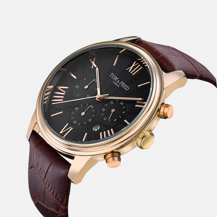 A chronograph watch constructed to suit classic British dress. This watch is constructed with the label's signature slimline stainless steel baton and roman numeric hour markers surrounding a guilloche textured face. Its quartz movement powers its main hands as well as a 3-dial chronograph stopwatch with second and 1/10 second display. A calendar window is featured at 4 o' clock. Finished with a luxe crocodile embossed leather strap with traditional buckle, this timepiece will add a subtle dose of sophistication to every look. This beautiful timepiece comes packed in a luxury Tom Fred beige gift box with a 1 optional year warranty. Note, this watch is not suitable for us in water. Please avoid ALL water and mositure. Note: The watch needs a fresh battery.