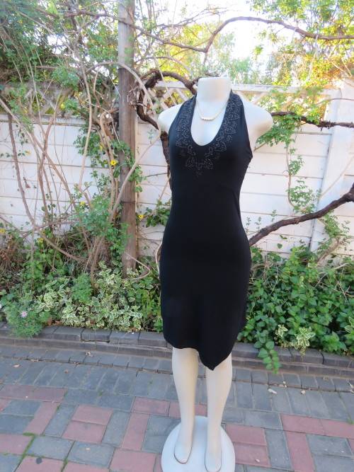 Top of the line black dress by 'LES POSSEDES' IN 32/8.Made in France.In polyamide stretch.Halter neck with stunning embellishment.Asymmetrical seamline.New cond.